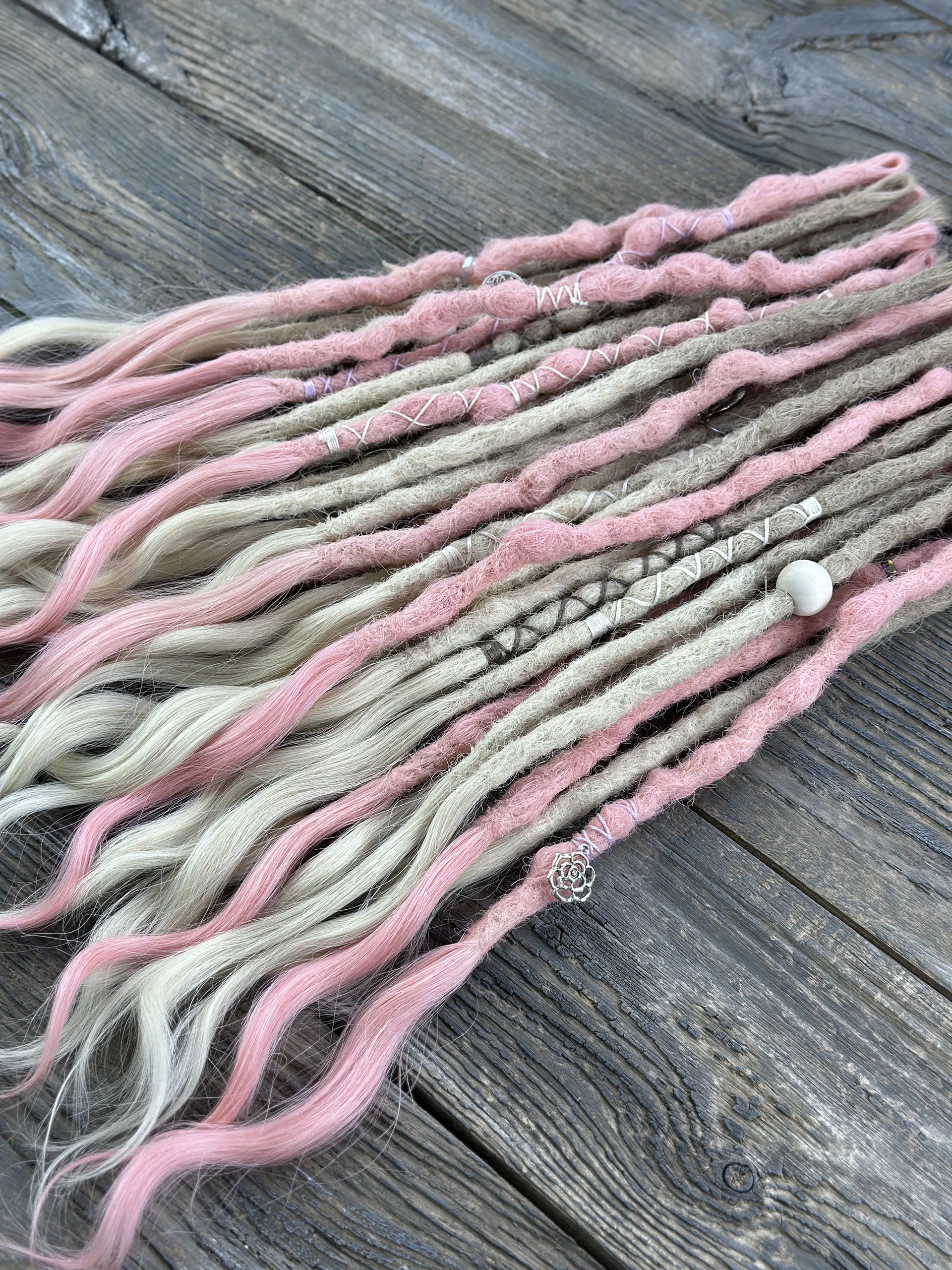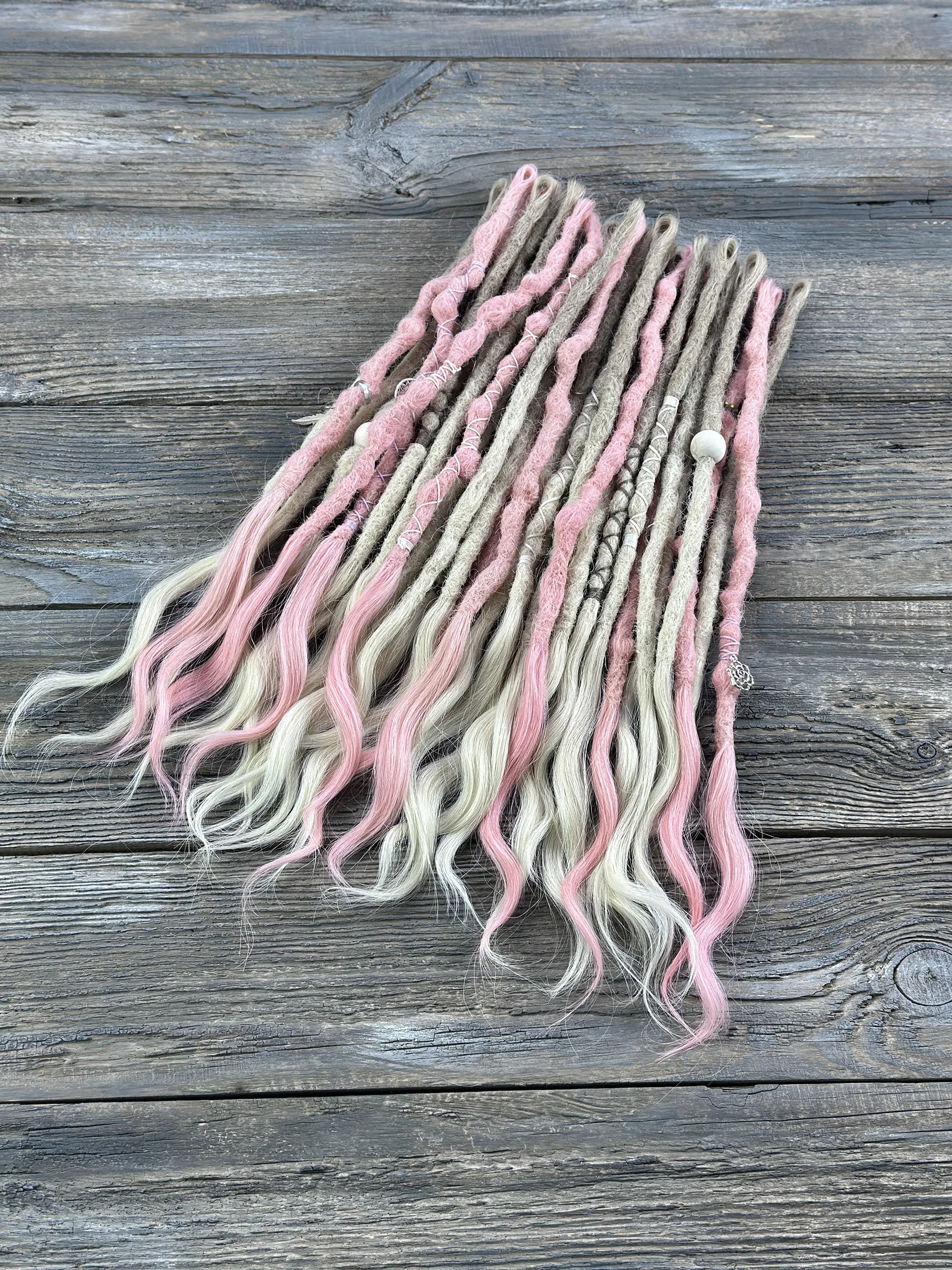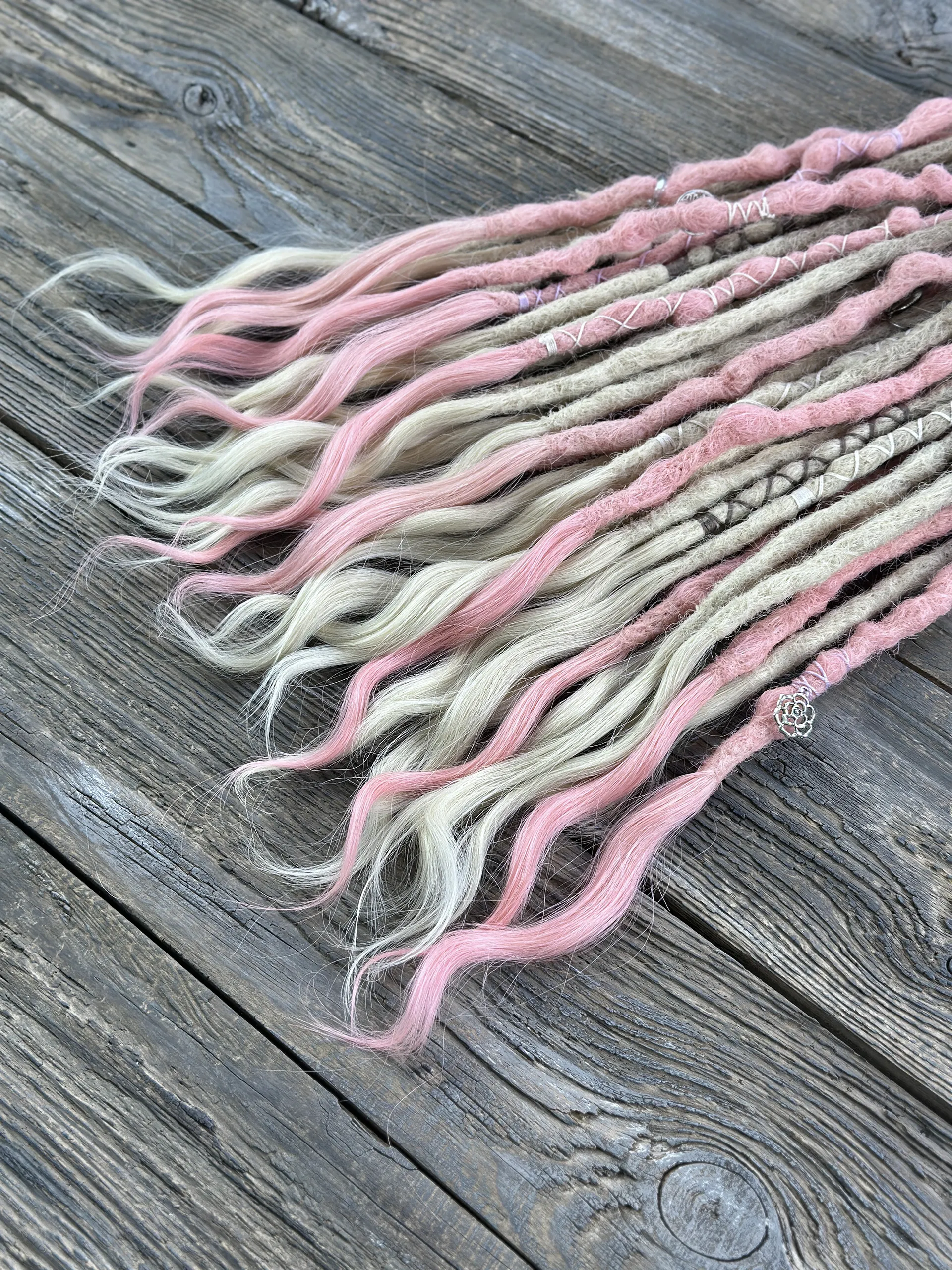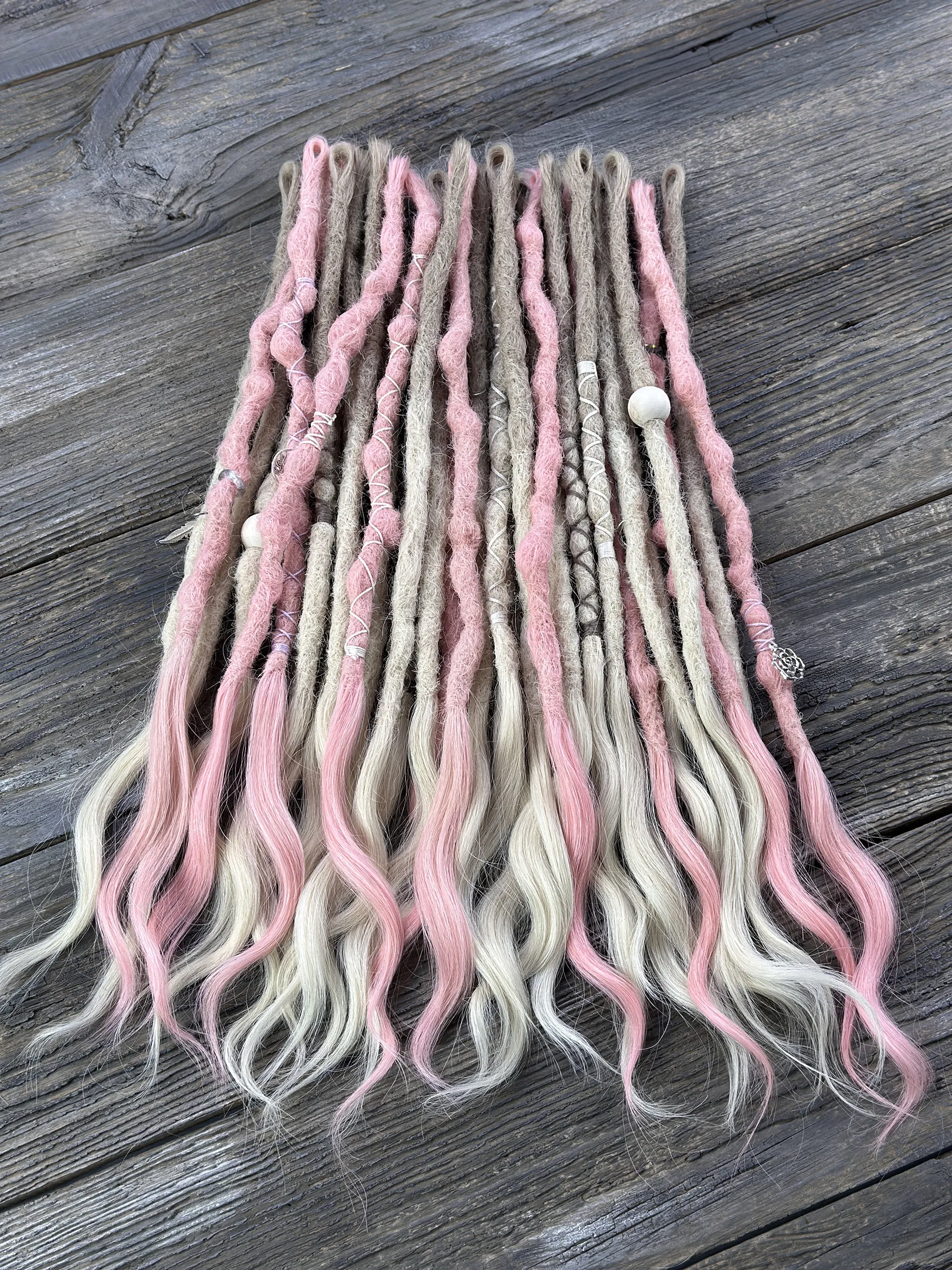Zartes Platinblond trifft auf weiches Pastellrosa — diese Echthaar-Dreadlock-Extensions bringen eine romantische, luftige Ästhetik in jeden Look. Jeder Dread wird von Hand aus 100 % natürlichem Menschenhaar gefertigt, mit offenen welligen Spitzen, weißen Perlen und silberfarbenen Anhängern.