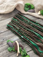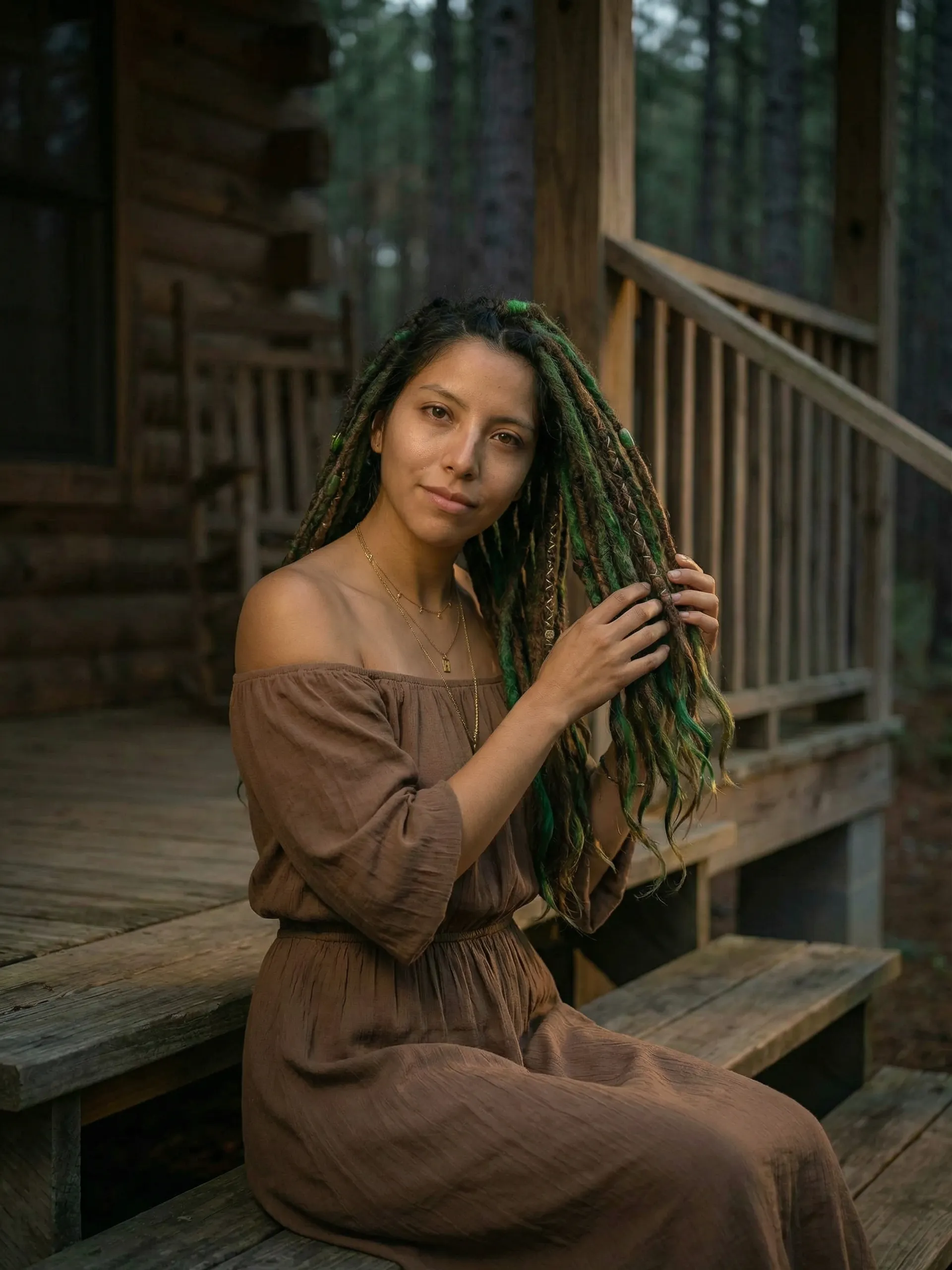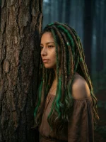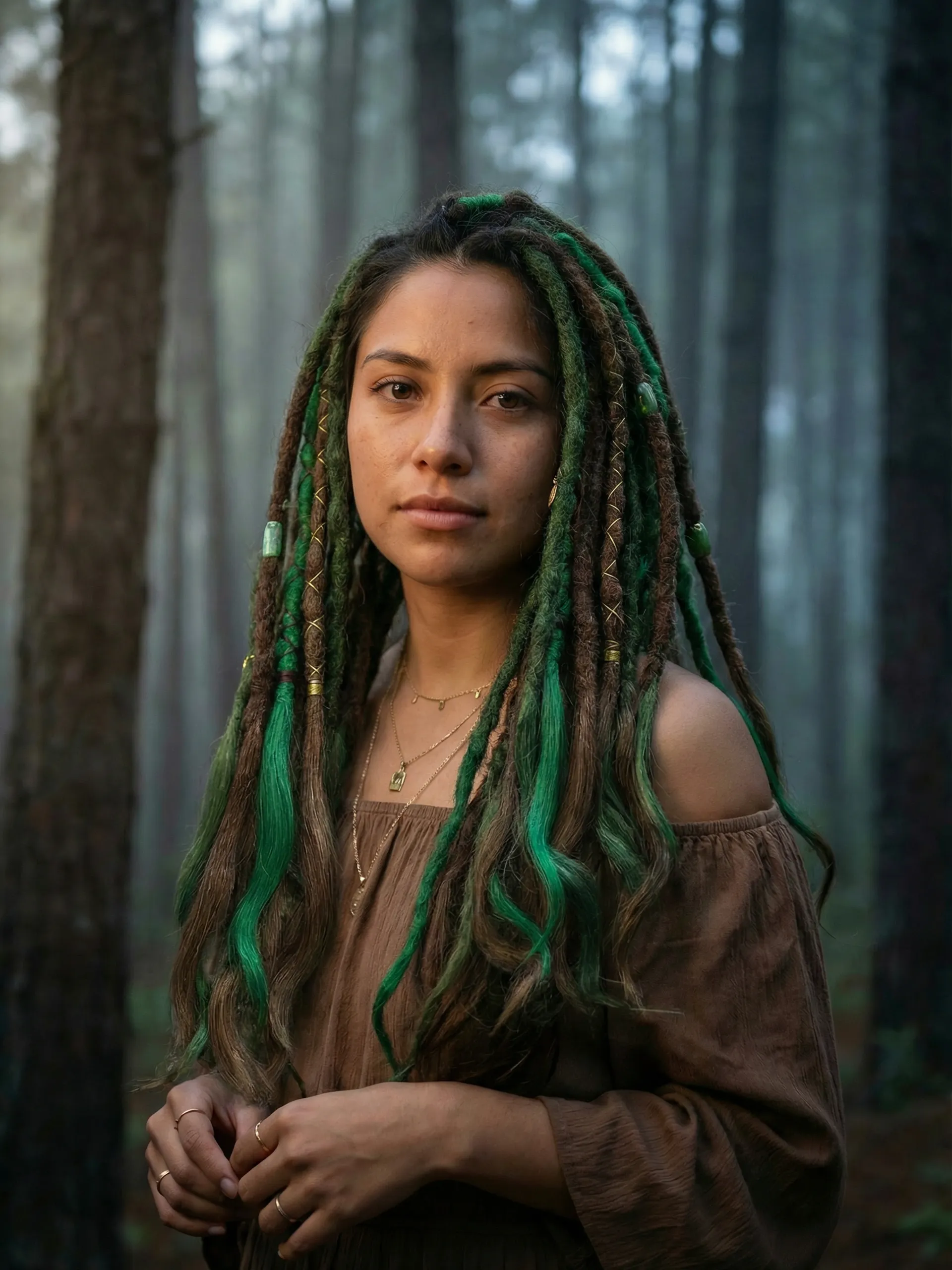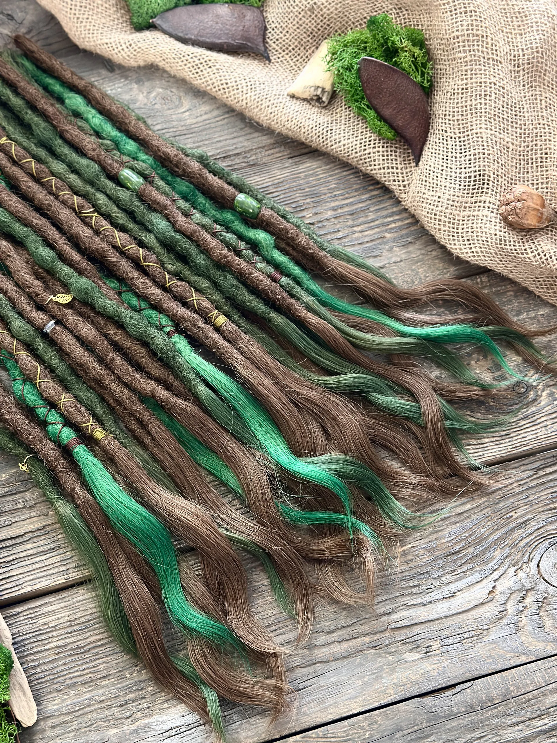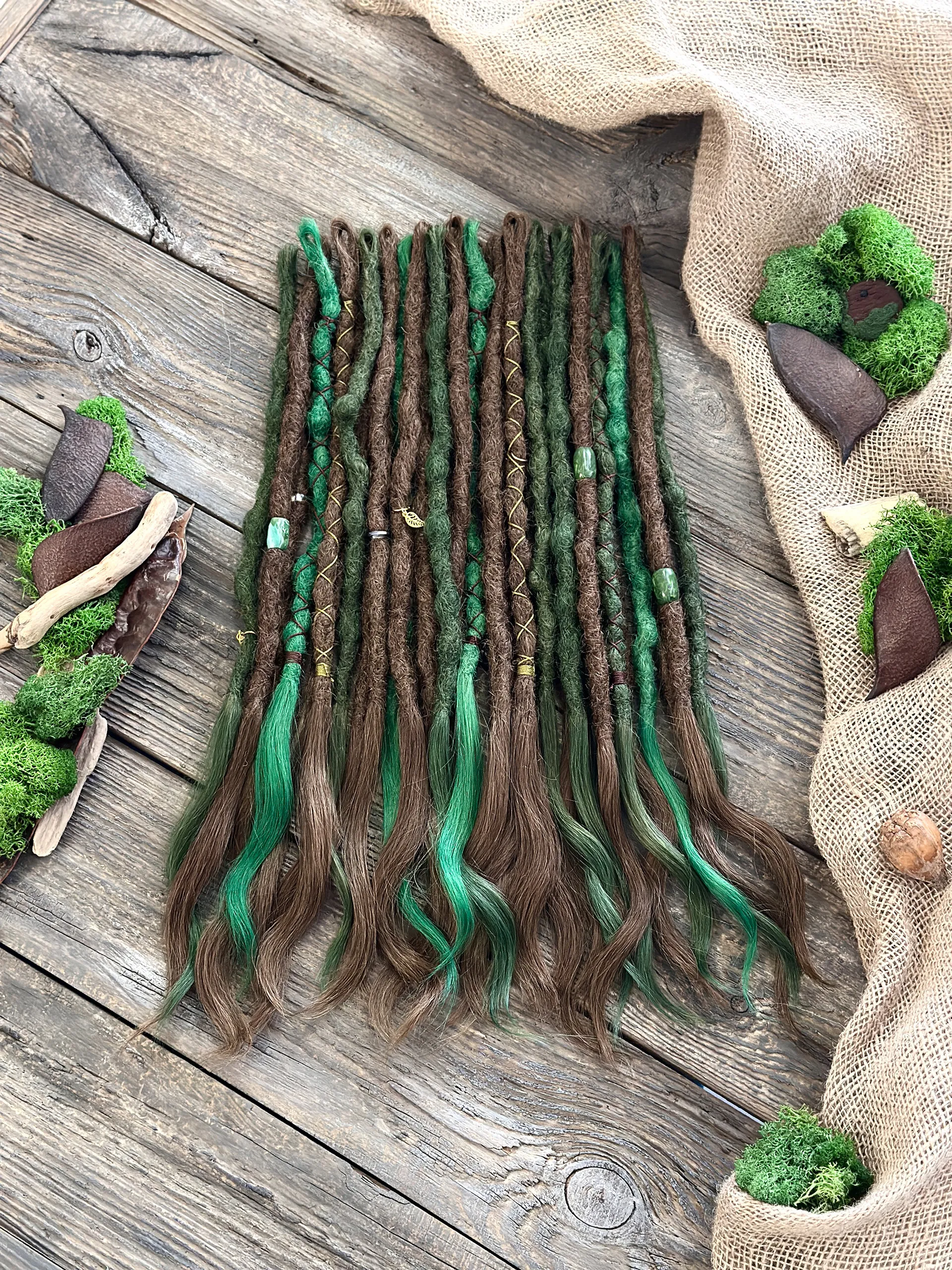 Warmes Kastanienbraun trifft auf leuchtendes Smaragdgrün — diese Echthaar-Dreadlock-Extensions fangen den Kontrast zwischen Waldboden und Blätterdach in jeder Strähne ein. Jeder Dread wird von Hand aus 100 % natürlichem Menschenhaar gefertigt, mit offenen welligen Spitzen und dekorativen Perlen samt goldfarbener Fadenwicklung.