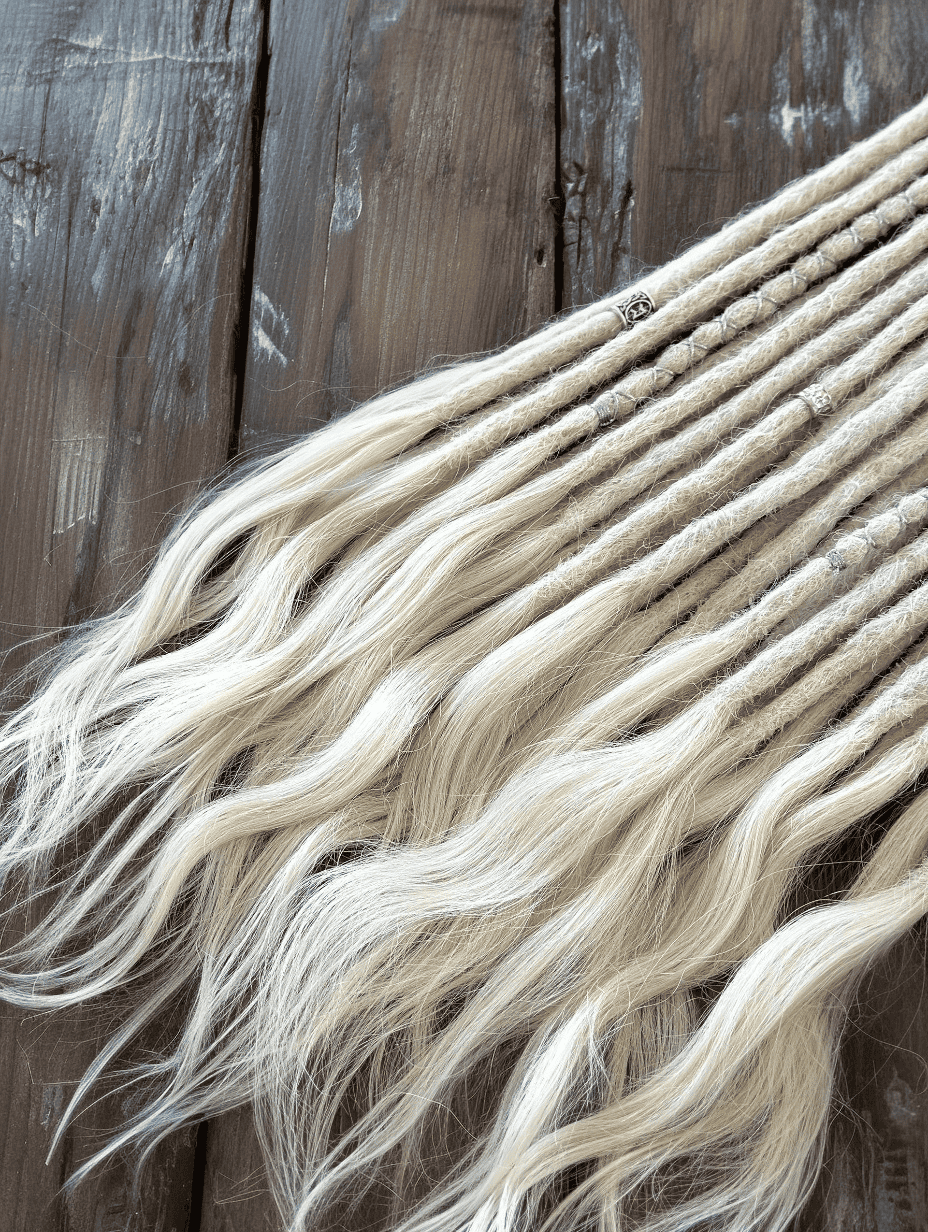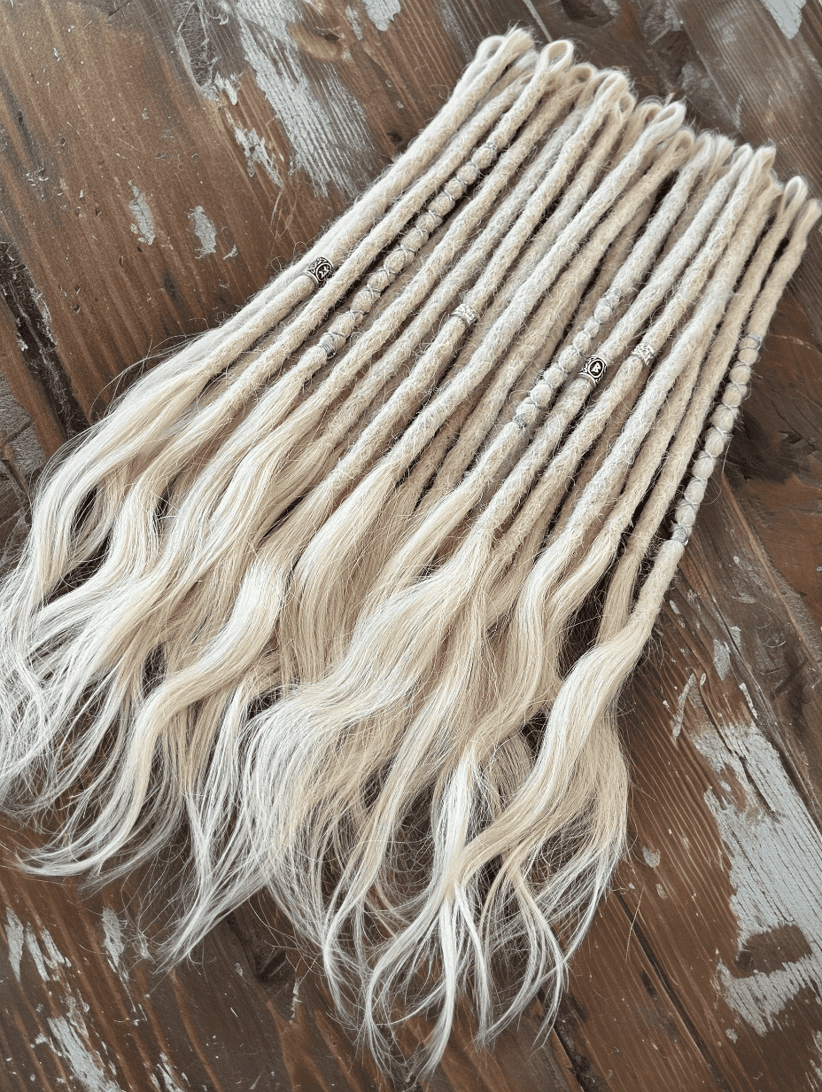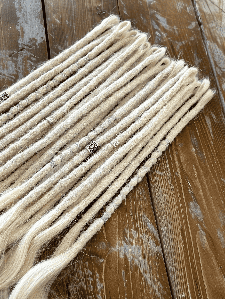 Каждый раз когда ко мне обращается человек для того чтобы я заплёл ему дреды, я создаю образ, я создаю нового человека из того который пришёл ко мне в салон. Создавая эти дреды, я думал о том, что они идеально подойдут девушке со светлыми волосами, можно оставить не заплетённую чёлку или же заплести и её тоже. Эти дреды идеально дополнят образ северной красавицы с белоснежными волосами. Если же вы являетесь такой, но живёте у океана, где солёный бриз увлажняет ваши волосы, а солнечные лучи старательно выкрашивают ваши волосы в светлые оттенки, то вам тоже идеально подойдут эти дреды. Я старался сделать уникальный набор дредов, который подойдёт вам. Если у вас другой цвет волос, не переживайте, мы можем изготовить для вас индивидуальный комплект дредов, именно под ваш цвет волос или цвет ваших глаз. Так же рекомендую обратить внимание на уже готовые дреды из натуральных волос.